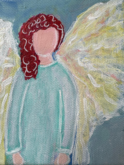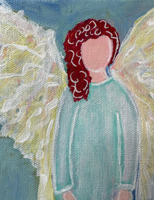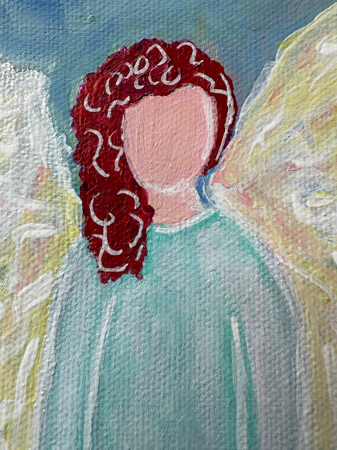 Angel has red hair and is wearing a blue gown and is part of The Tattered Artist's Angel Collection, designed and painted by Deborah Watson Andress.