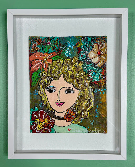 Part of the Mardi Gras Queens Collection. Each queen was brought to life through Deborah Andress's signature Tattered Artist process--a soulful blend of acrylic paint, layered paper, found ephemera, and tiny jeweled details. These 8x10 mixed media artworks are built with texture and whimsy, each one telling her own story of grace, joy, and Southern spirit.
