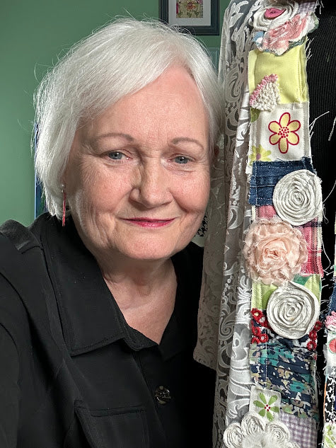 Once a delicate lace coverup, 'Hattie' has been lovingly transformed into a one-of-a-kind wearable story. Along her front edge runs a handmade roll of tattered fabrics--threads of past beauty woven into new beginnings. The bottom hem is finished with antique doilies, each one carrying whispers of the hands that once created them. Every stitch tells a story of grace reclaimed and beauty reborn--an heirloom reimagined for today's free-spirited soul.