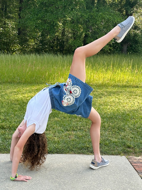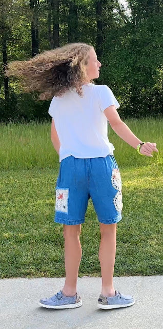 The 'Jessie' is a pre-loved, pull-on, lightweight short that has been upcycled with 'true antique' crocheted doilies, handstitched and loved by my grandmother over 100 years ago. 'Jessie' was known for her intricate, attention-to-detail handwork; and that work is displayed on these shorts. In addition, the shorts have been upcycled with beautiful fabric flowers and miscellaneous buttons. The shorts have a drawstring.
