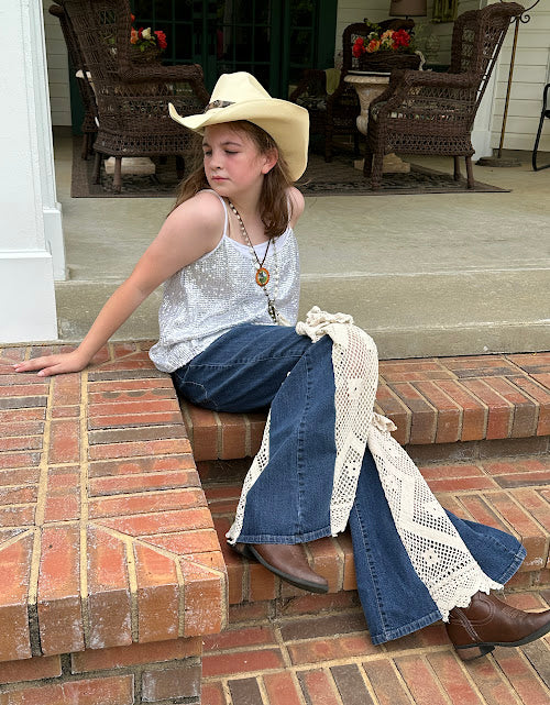 The 'Martha' is a soft, stretchy flare denim jean that has been upcycled with inserts of beautiful vintage crocheted lace in the center fronts and backs of each leg to further widen them to a whopping 38 inches. At the top of each crocheted insert sits a crocheted floral embellishment that adds even more drama to these lovely jeans. Like my friend, Martha, they are just as comfortable at a casual affair as they are all dressed up. Wear them during the day; then, layer on some necklaces and a lacy top and you're ready for an evening out with friends.